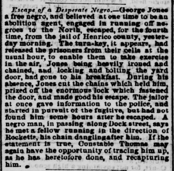 But that is not the end of the story. In June 1860 the Daily Dispatch reported that George—now described as “a free negro, and believed at one time to be an abolition agent, engaged in running off negroes to the North” – had escaped yet again from the Henrico jail.