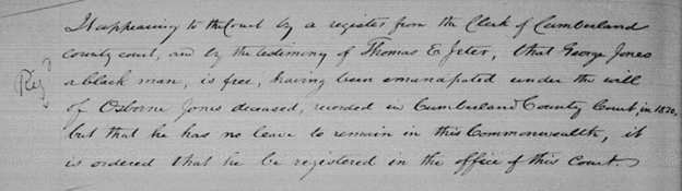 “It appearing to the Court by a register from the Clerk of Cumberland County Court , and by the testimony of Thomas E. Jeter,[3] that George Jones a black man, is free, having been emancipated under the will of Osborne Jones deceased, recorded in Cumberland County Court, in 1820, but that he has no leave to remain in this Commonwealth, it is ordered that he be registered in the office of this Court.”[4]