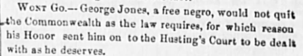 The records from 1854 show the courts’ frustration deepening. In March, George Jones – now regularly described as “an emancipated negro” – was again sent to the Hustings Court “for refusing to leave the Commonwealth as directed by law.”[28] Another notice, titled “WON’T GO,” made the point more bluntly: George “would not quit the Commonwealth as the law requires,” so the mayor sent him on to be “dealt with as he deserves.”[29]