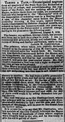 Two different newspapers highlighted the implications. One described Carrington as professing ignorance that he had no right to “buy a free Negro of himself” and noted that he claimed to have acted only “to save him from being sent from the state.” Another reported that Carrington was ready to help crack down on other cases in which free people were being illegally kept in the city and boasted that he knew of “hundreds” of such examples. In both accounts, George Jones appears as a test case: a man whose determination to stay had pushed him to conspire with an affluent to invent a private workaround to the state’s ban on remaining.
