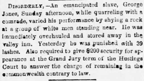 The Richmond Dispatch reported the consequences in a brief paragraph, under the heading “DISORDERLY”: George – described pointedly as “an emancipated slave” – was punished with 39 lashes and required to give $200 security for his appearance before the Hustings Court grand jury “to answer the charge of remaining in the commonwealth contrary to law.”[14] In one sentence, the paper connected his spontaneous act of defiance on a Sunday afternoon to the state’s determination to rid itself of people like him. A white man named William H. Eggleston[15] put up the $200 bail, and George was scheduled to appear in court on 14 February 1853.[16]