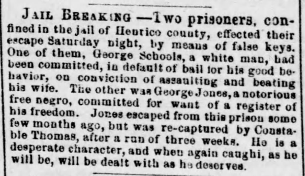 By early 1859, Henrico County officials had begun to describe George in language that echoed the way white neighbors once spoke of his father Essex. In March, after he and a white prisoner named George Schools escaped from the county jail using false keys, a newspaper called George “a desperate character” and warned that, when caught, “he will be dealt with as he deserves.” A few months later another paper labeled him “one of the most desperate free negroes that has been caged for a long time,” emphasizing that this was the third time he had been arrested and recounting his previous escapes in detail.