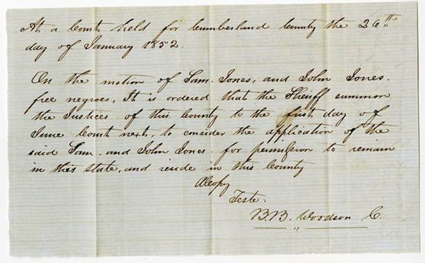 [2] Jones, Samuel : Petition to Remain in the Commonwealth, Cumberland County (Va.) Free Negro and Slave Records, 1753-1865 , Virginia Untold: The African American Narrative, Library of Virginia Digital Collections; https://lva.primo.exlibrisgroup.com/permalink/01LVA_INST/br4o1h/alma9917832401105756