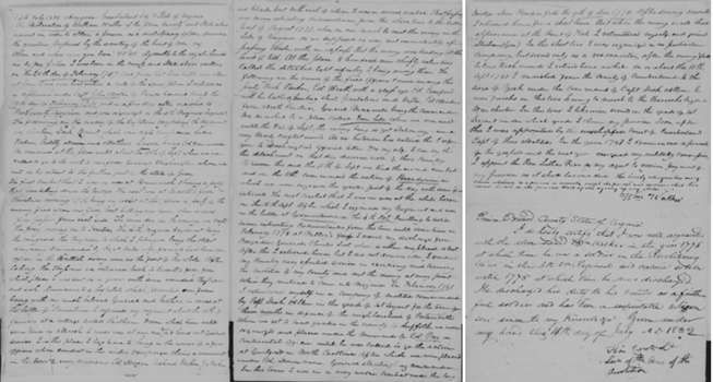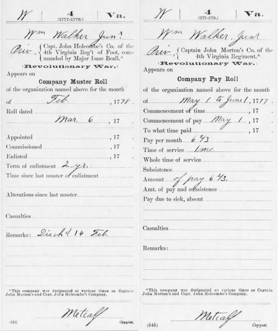 [10] Military Record: Vol. VIII, p. 455, Revolutionary Soldiers of the State of Virginia-Library Report, Nat. No. 141, 433, Record of the Pension Office, Saffell’s List. On 14 Jul 1832, William Walker gave an account of his service record as a Revolutionary War soldier to obtain his pension.
