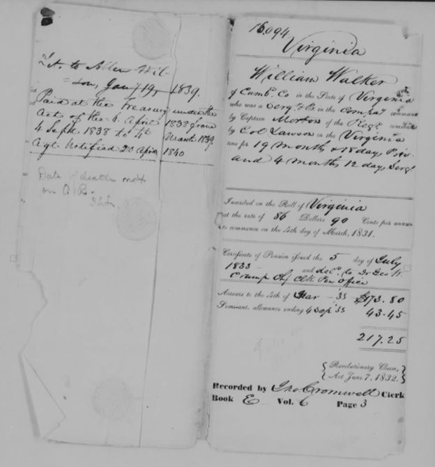 [1] Military Record: Vol. VIII, p. 455, Revolutionary Soldiers of the State of Virginia-Library Report, Nat. No. 141, 433, Record of the Pension Office, Saffell’s List. On 14 Jul 1832, William Walker gave an account of his service record as a Revolutionary War soldier to obtain his pension. Digitally available at Fold3.com (subscription required) – US, Revolutionary War Pensions, 1800-1900, Pub. No. M804, Nara catalog id 300022, Nara catalog title, Case Files of Pension and Bounty-Land Warrant Applications Based on Revolutionary War Service, compiled ca. 1800 – ca. 1912, documenting the period ca. 1775 – ca. 1900, Publisher NARA, Record group 15; https://www.fold3.com/image/19827153/walker-william-page-1-us-revolutionary-war-pensions-1800-1900