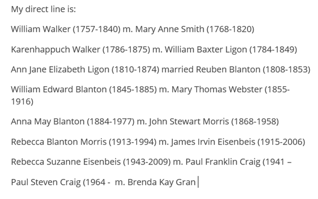 He likely descends from the William Walker (c.1640-c.1723), who appears as a headright of Charles Edmonds in New Kent County in 1658 where Edmonds was granted 2750 acres in New Kent County for the importation of 55 people into the Colony. John Davis was the original person who had received most of that acreage, but he assigned or sold the rights to Edmonds. Another headright on that list was Francis Warren. Both men came to Virginia as indentured servants.[19] William Walker later married a daughter of Francis Warren and had children including a son named William II (c. 1690-c.1752) who was the first of this line to settle in Cumberland County, Virginia and the grandfather of the subject of this blog post.